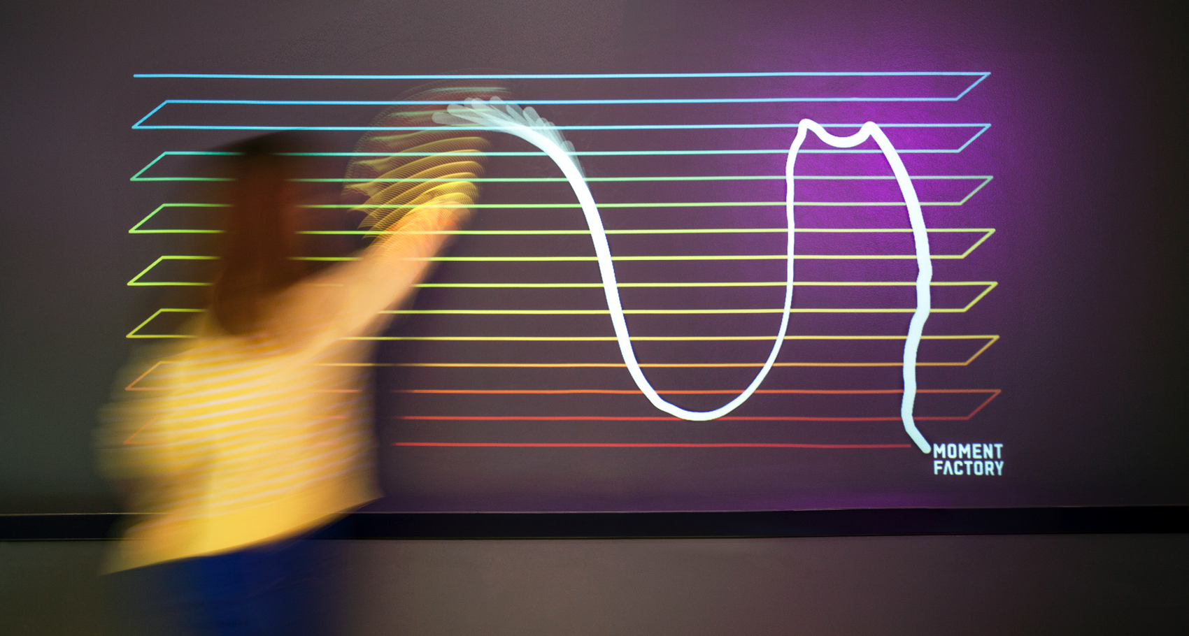 Our piece this year is an abstract exploration of touch, sound and gesture; something akin to a living abstract painting. Visitors discover a world of colour, shape, sound and movement in constant evolution by exploring the myriad hidden affordances of the system. Each person can also leave their trace, which then serves as the starting point for the next user’s own playful exploration.