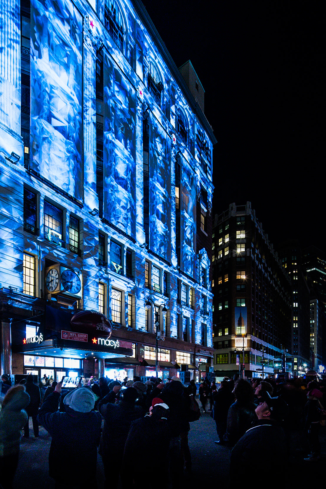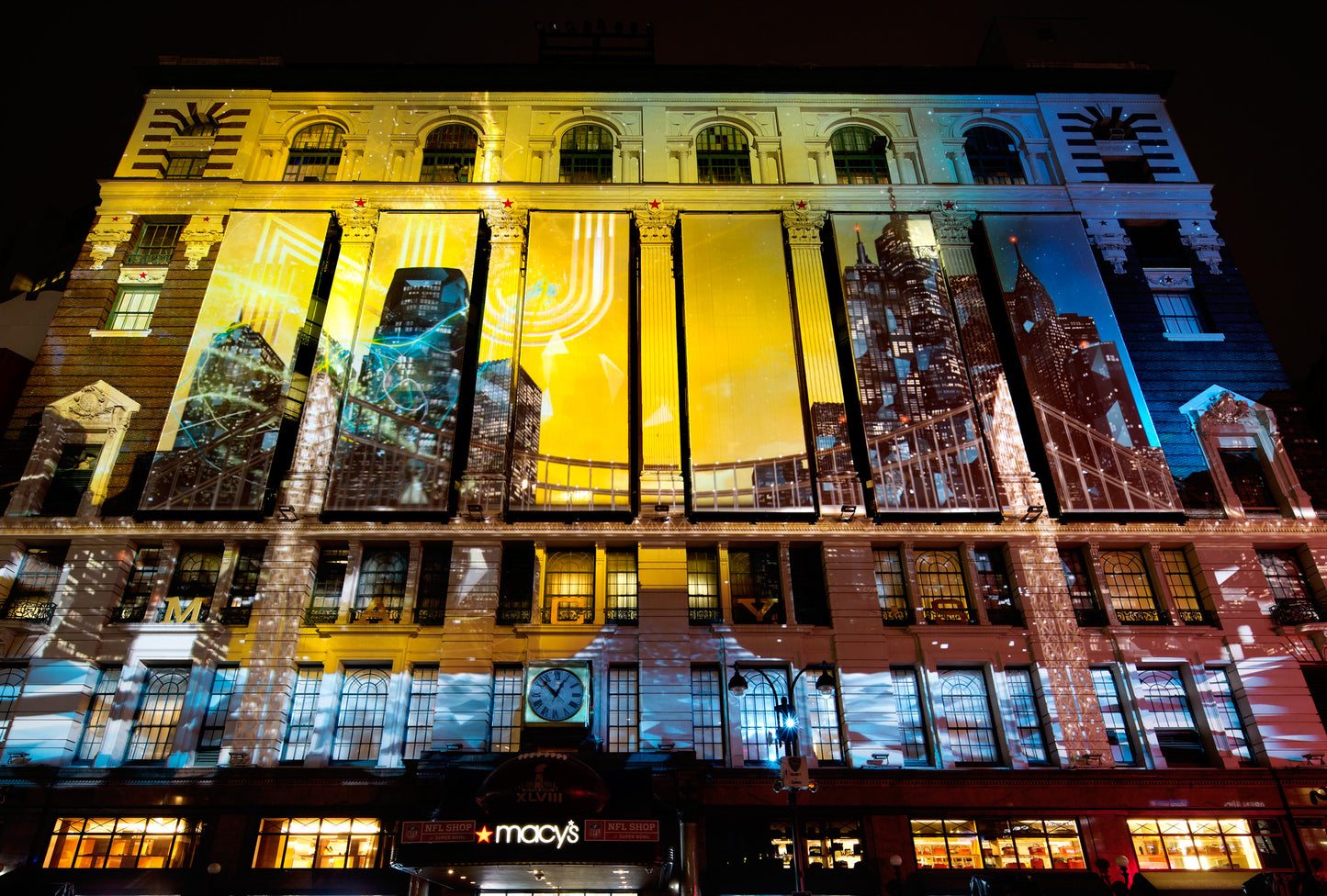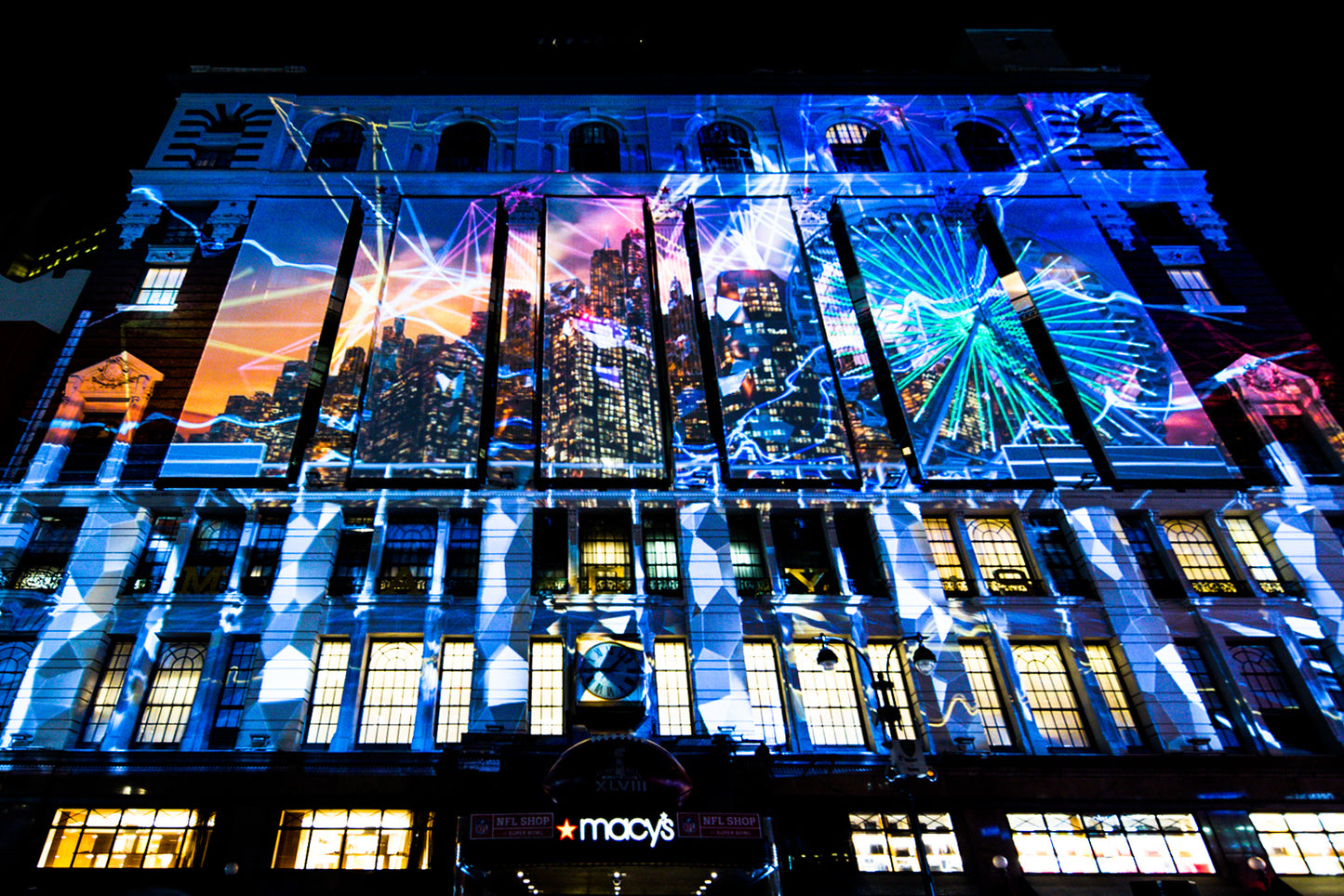 OCCUPYING MIDTOWN MANHATTAN WITH THE SPIRIT OF ‘AMERICA’S GAME’, Extending the experience beyond the main event: occupying midtown Manhattan with the spirit of ‘America’s game.’, Custom, , , , United States, , New York, Business Objectives: Create Innovative Experience Engage Audience Services: Pre-rendered Content Creation Large Scale Content Creation, NFL fans were treated to a panoply of archival NFL footage ranging from 8-millimeter film to digital in addition to 2D and 3D animation. The whole was accompanied by an original soundtrack with special effects and surround sound. For four nights, the eight-minute show was projected every half hour on the iconic Macy’s storefront, a surface of 3390 square feet. Our team took special care to complement Macy’s unique architecture and the busy urban setting as with projection-mapping we transformed the building into a screen, then to a portal, and finally to a trompe-l’oeil shifting landscape. The show was located at the entrance of “Super Bowl Boulevard” as the main attraction in a series of football-themed events spanning Broadway from 34th to 47th Street. Its scale and ability to gather a crowd established it as ‘the place to be’ to celebrate before the big game., Stadiums Arenas, Building Facade, Projection Mapping, Visual Content Creation Production, Digital Artwork