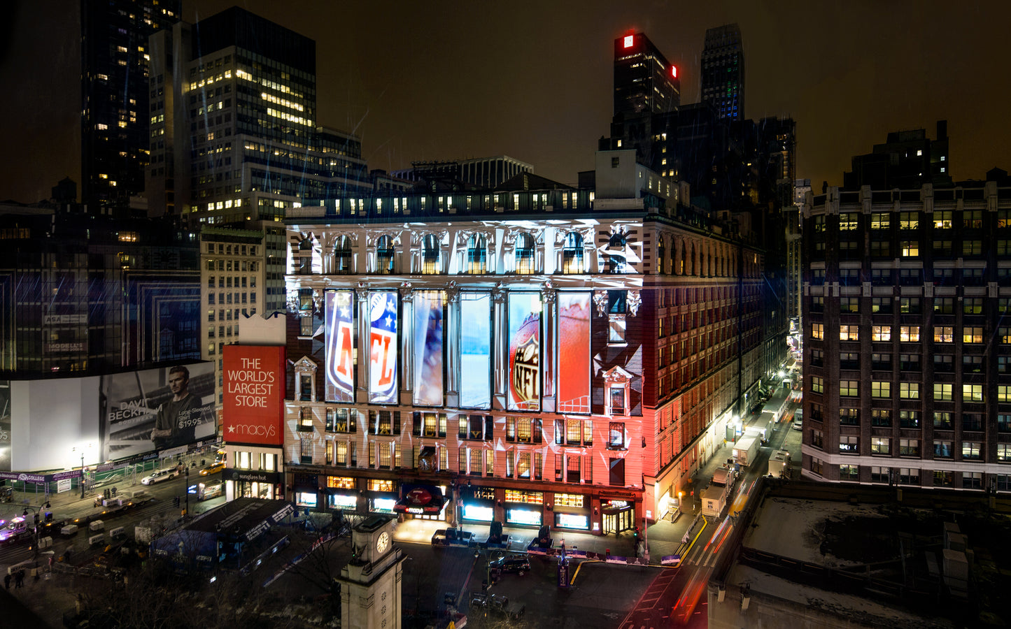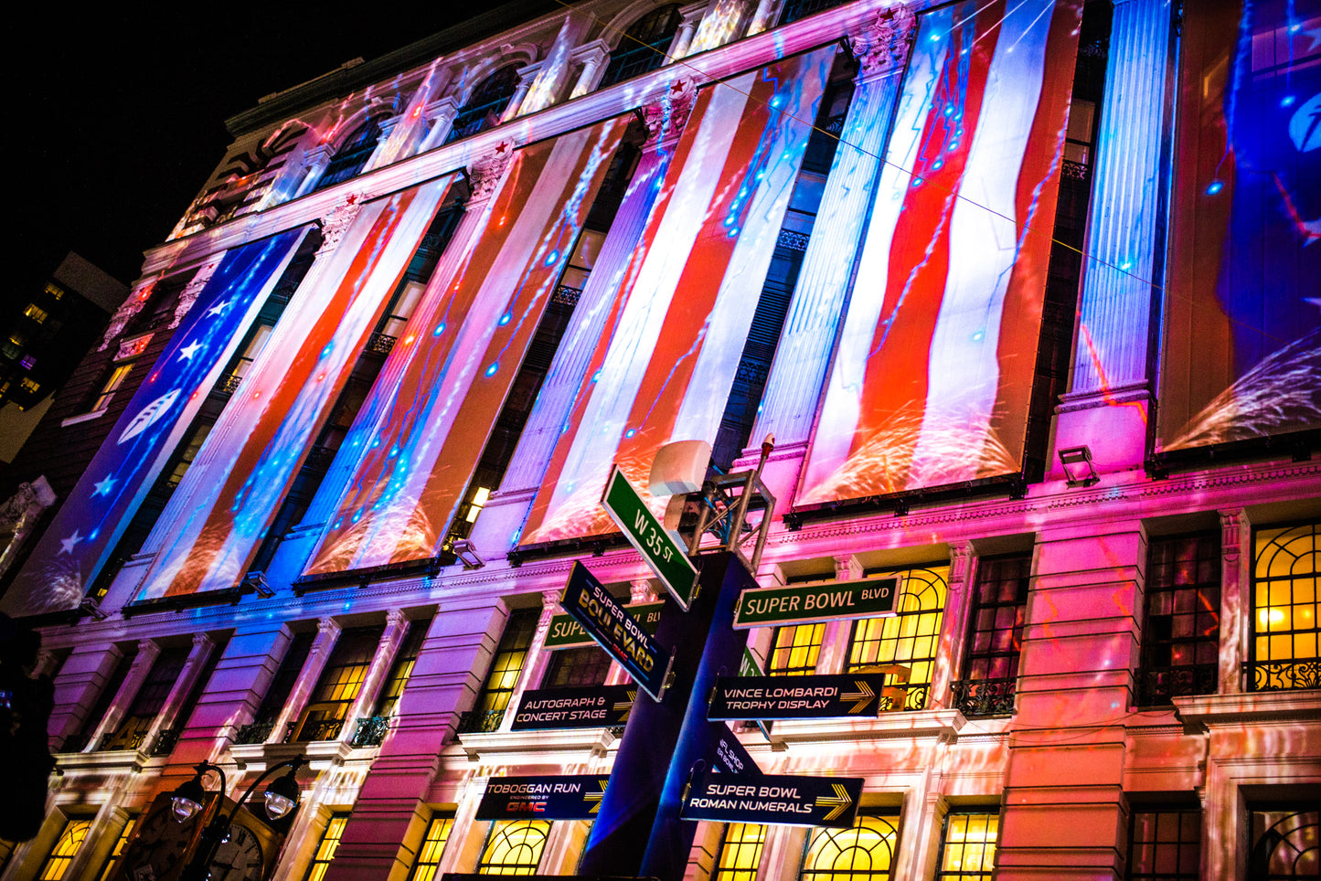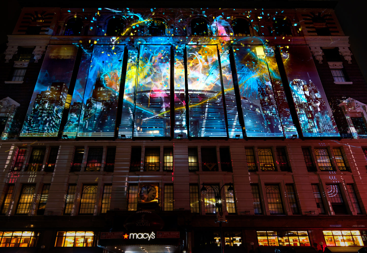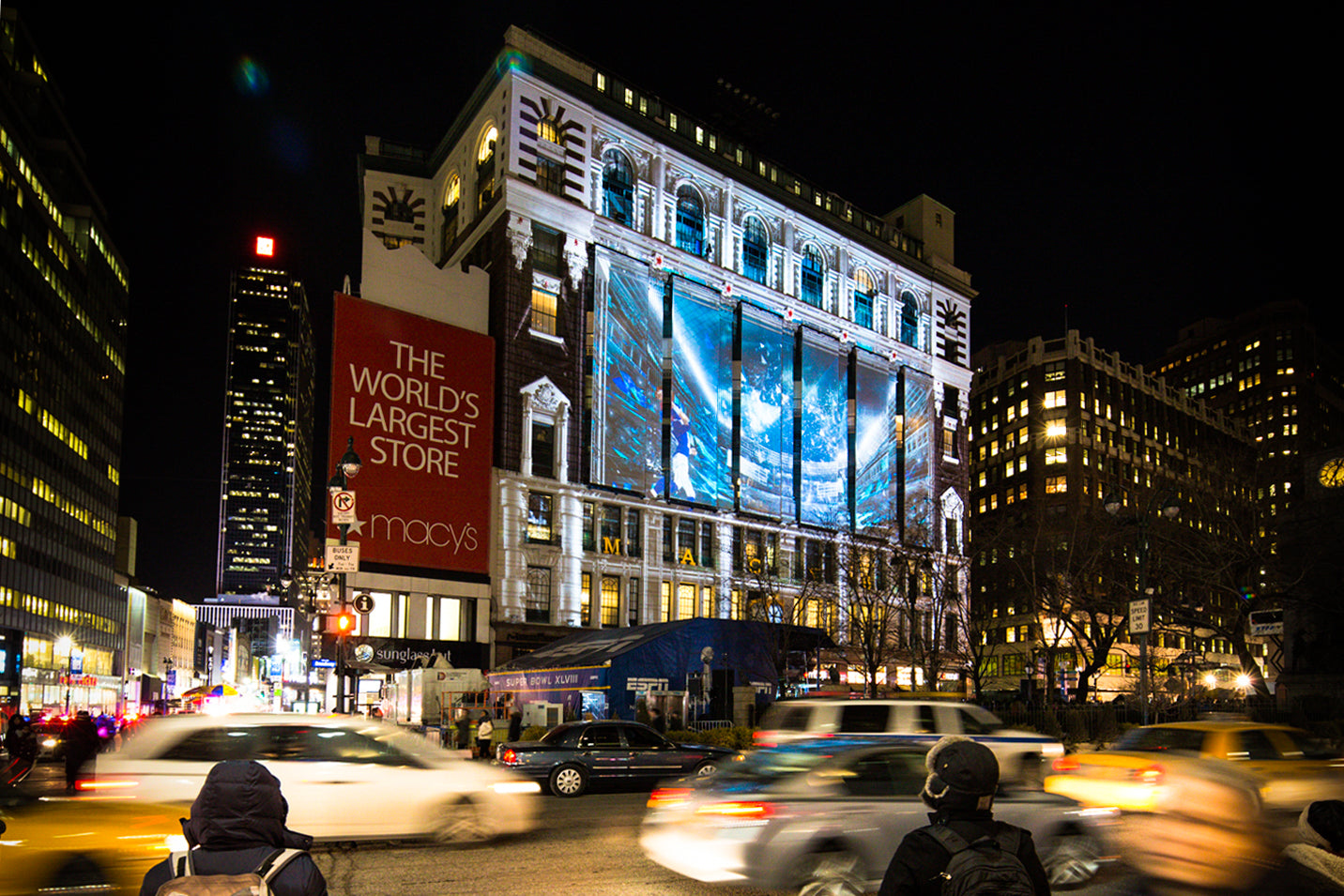 OCCUPYING MIDTOWN MANHATTAN WITH THE SPIRIT OF ‘AMERICA’S GAME’, Extending the experience beyond the main event: occupying midtown Manhattan with the spirit of ‘America’s game.’, Custom, , , , United States, , New York, Business Objectives: Create Innovative Experience Engage Audience Services: Pre-rendered Content Creation Large Scale Content Creation, NFL fans were treated to a panoply of archival NFL footage ranging from 8-millimeter film to digital in addition to 2D and 3D animation. The whole was accompanied by an original soundtrack with special effects and surround sound. For four nights, the eight-minute show was projected every half hour on the iconic Macy’s storefront, a surface of 3390 square feet. Our team took special care to complement Macy’s unique architecture and the busy urban setting as with projection-mapping we transformed the building into a screen, then to a portal, and finally to a trompe-l’oeil shifting landscape. The show was located at the entrance of “Super Bowl Boulevard” as the main attraction in a series of football-themed events spanning Broadway from 34th to 47th Street. Its scale and ability to gather a crowd established it as ‘the place to be’ to celebrate before the big game., Stadiums Arenas, Building Facade, Projection Mapping, Visual Content Creation Production, Digital Artwork
