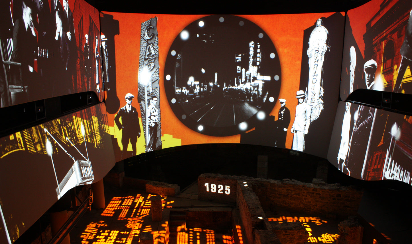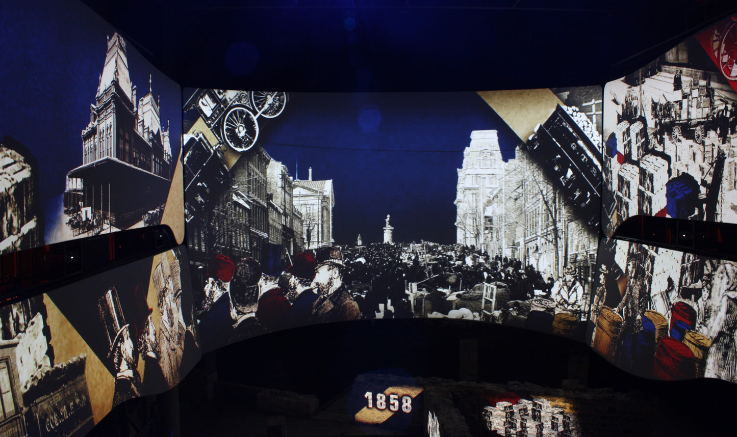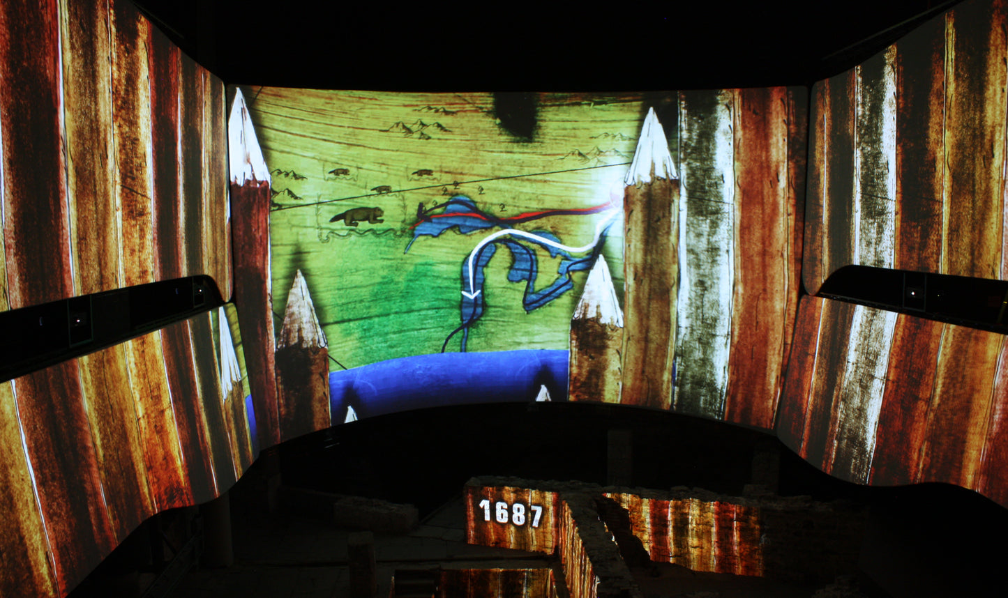 Ce spectacle était une occasion parfaite pour exposer notre passion pour la création et le travail dans des espaces déjà existants: intégrer et adapter une présence architecturale à l’atmosphère générale du spectacle. Dans ce cas-ci, notre défi, qui se révélait aussi notre chance, était de projeter les animations directement sur les ruines, témoins véritables de l’histoire de la ville. Pour magnifier les vestiges imposants sans les éclipser, nous avons aménagé une série d’écrans de 270 degrés autour des visiteurs. L’approche privilégiée pour le contenu intégrait des images, de l’éclairage et du son. Suivant une direction artistique qui valorise le réalisme historique, les images et les documents ont été présentés dans un souci de respecter leur authenticité. L’équipe de Moment Factory a ajouté une touche visuelle subtile au projet afin de produire un effet vibrant et d’assurer une cohésion esthétique.