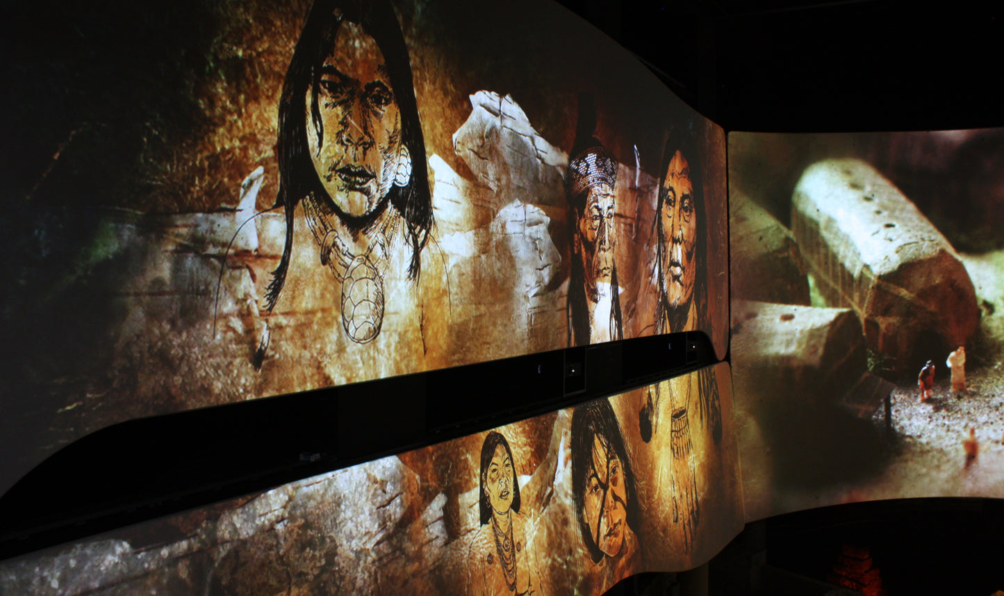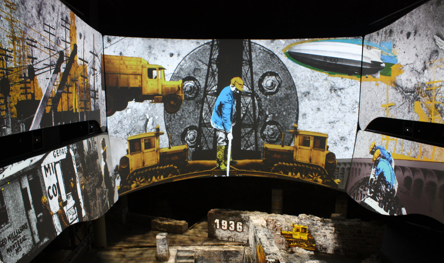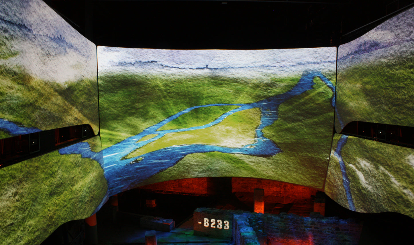 Ce spectacle était une occasion parfaite pour exposer notre passion pour la création et le travail dans des espaces déjà existants: intégrer et adapter une présence architecturale à l’atmosphère générale du spectacle. Dans ce cas-ci, notre défi, qui se révélait aussi notre chance, était de projeter les animations directement sur les ruines, témoins véritables de l’histoire de la ville. Pour magnifier les vestiges imposants sans les éclipser, nous avons aménagé une série d’écrans de 270 degrés autour des visiteurs. L’approche privilégiée pour le contenu intégrait des images, de l’éclairage et du son. Suivant une direction artistique qui valorise le réalisme historique, les images et les documents ont été présentés dans un souci de respecter leur authenticité. L’équipe de Moment Factory a ajouté une touche visuelle subtile au projet afin de produire un effet vibrant et d’assurer une cohésion esthétique.