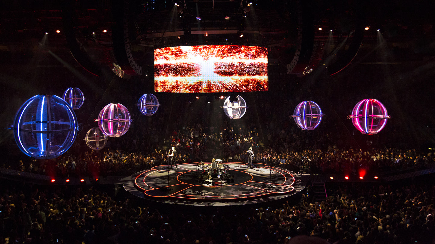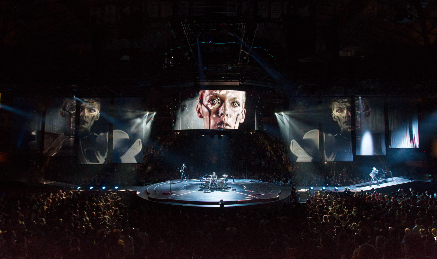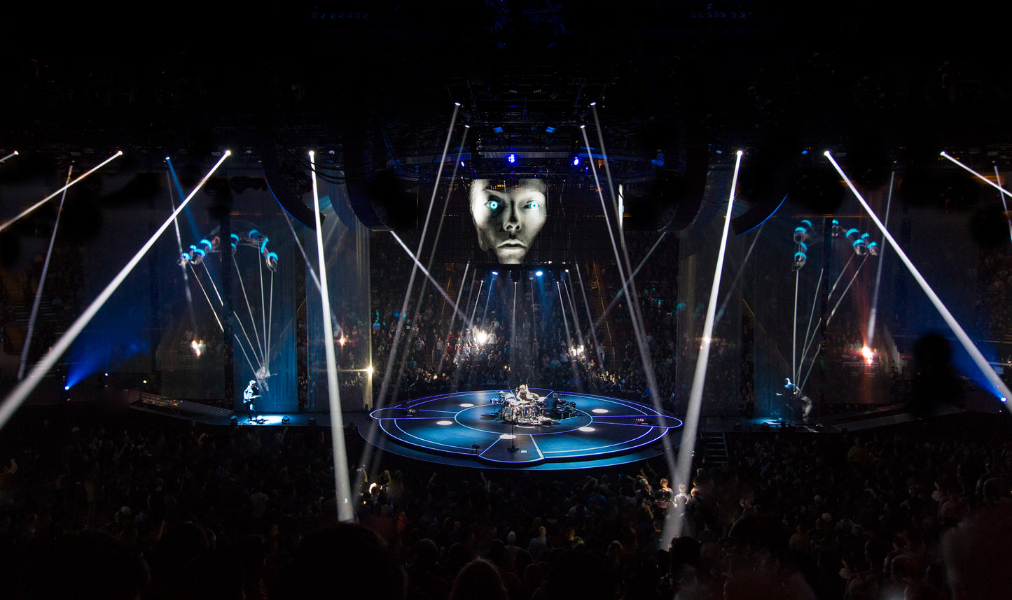 Designed by Oli Metcalfe, the show sees the trio getting up close with their fans – instead of a usual stadium stage set-up, they’re performing in the middle of the arena in the round on a rotating central platform with two extended catwalks kitted-out with giant projection screens. Inspired by the album’s themes of dehumanizing warfare and indoctrination, visuals feature gyrating apocalyptic figures, epic slow motion sci-fi riots, performer tracking video, and a few high-tech surprises.