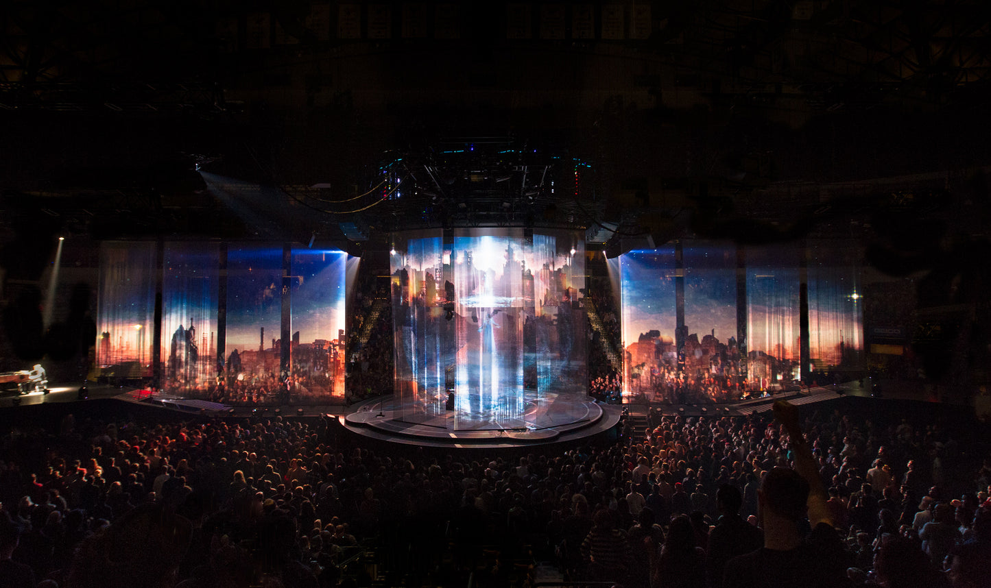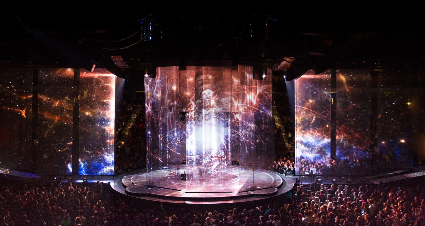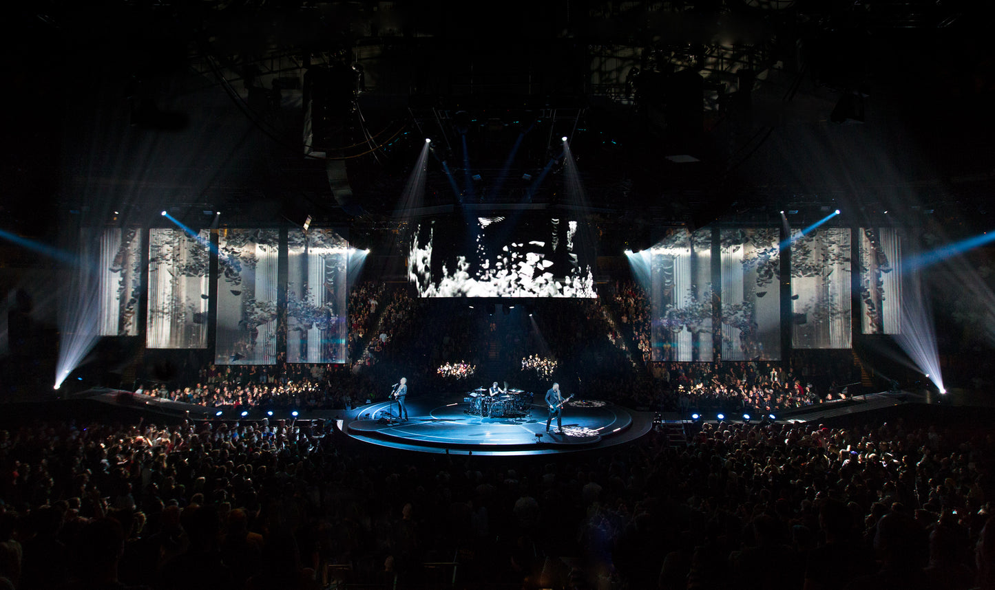 Designed by Oli Metcalfe, the show sees the trio getting up close with their fans – instead of a usual stadium stage set-up, they’re performing in the middle of the arena in the round on a rotating central platform with two extended catwalks kitted-out with giant projection screens. Inspired by the album’s themes of dehumanizing warfare and indoctrination, visuals feature gyrating apocalyptic figures, epic slow motion sci-fi riots, performer tracking video, and a few high-tech surprises.