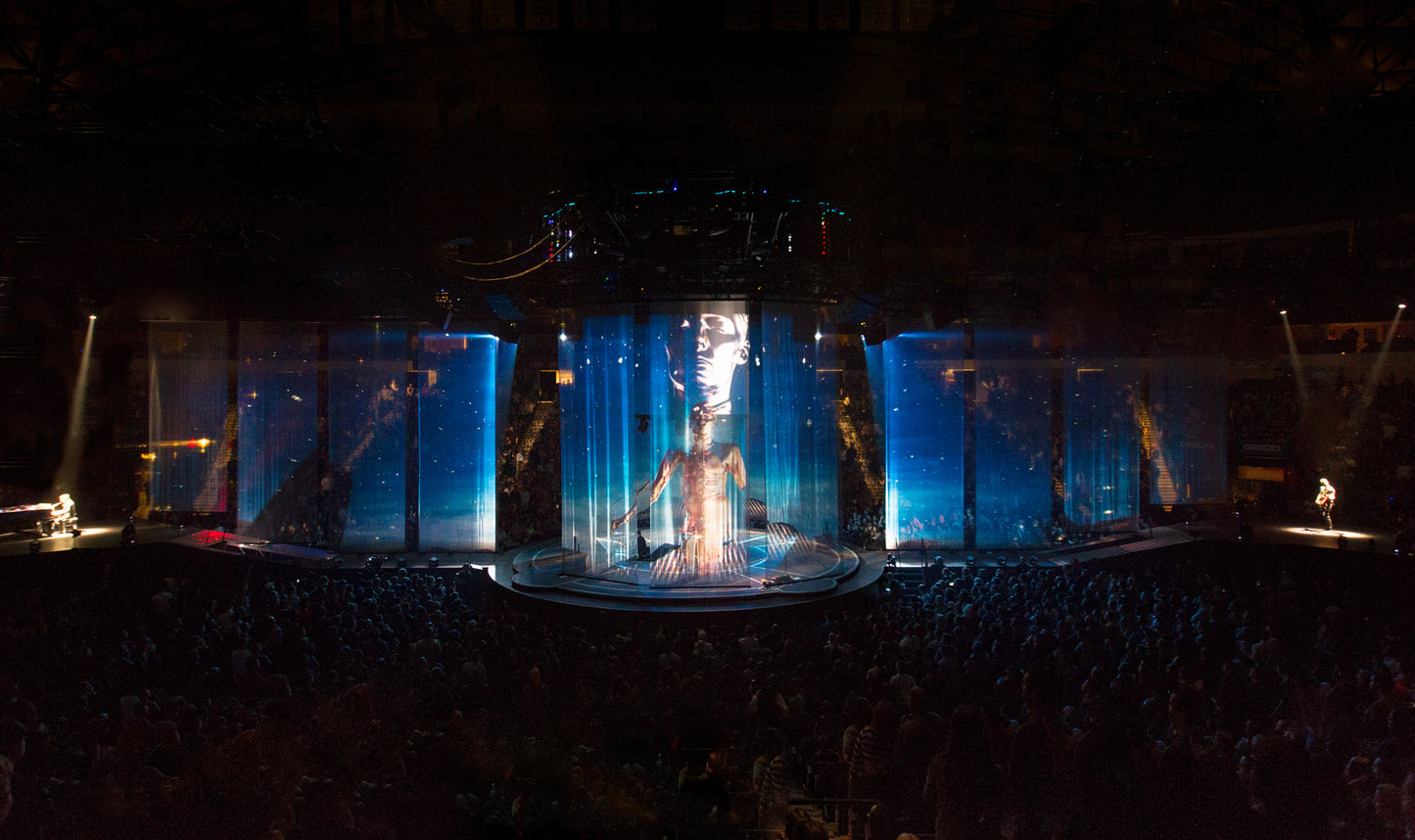 This tour is one of Moment Factory’s most ambitious collaboration, featuring a system of 3D cameras and custom realtime effects pumping out responsive visuals to 12 powerful Barco projectors. Original particle, distortion, and mosaic effects also process I-MAG feeds in realtime. Adding to the dramatic atmosphere and playing up the surveillance theme, an extensive BlackTrax 3D-tracking system featuring 38 infrared cameras allows for visual effects, sound, and light cues to track band members as they move across the stage.
