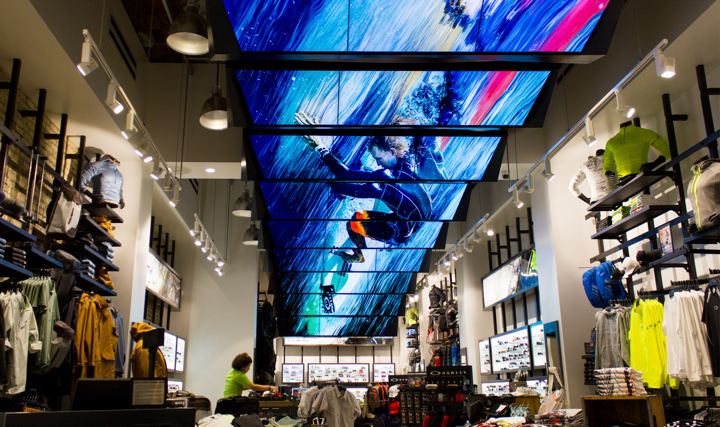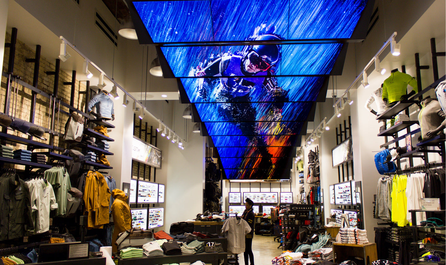 TURNING A STORE INTO A DESTINATION ON THE 5TH AVENUE, Creating a living, breathing installation, embodying the renegade spirit of Oakley’s design ethos., Custom, , , , United States, Public Spaces, Hospitality Leisure, New York, Business Objectives: Enhance Content Display Increase Brand Exposure Generate Footfalls Services: Technical Design Scenography Pre-rendered Content Creation Large Scale Content Creation Turnkey Services, When we first looked at the plans for the retail space, our biggest challenge was clear. Space is at a premium in this location and it would be essential to maximize retail opportunities. At the same time, this being a flagship location and the home base of a new and significant brand initiative, we knew Oakley needed a stunning installation to draw customers into their world and deliver their message. We turned to the only space unoccupied by retail display, the ceiling, and quickly set to work developing a concept and design to maximize the large overhead canvas. The final installation features 27 LCD screens on an angled cascade running the length of the ceiling. This design allows both separate screen and full-canvas display. The design is also intended to draw customers forward into the retail space. In this way, customers’ engagement with the lifestyle and vision of the brand leaves them immersed in the Oakley world, where all valuable wall and floor space is available for sales and merchandising. Content merges a visual language we developed especially for the brand with video footage of Oakley’s performance athletes. In all, this one-of-a-kind installation tells the story of Oakley’s inspiration and drive to develop forward-thinking technologies as well as how this mandate serves the athlete seeking to raise his or her game., Malls Retail Spaces, Digital Artwork, Branded Contents, Visual Content Creation Production, Digital Placemaking