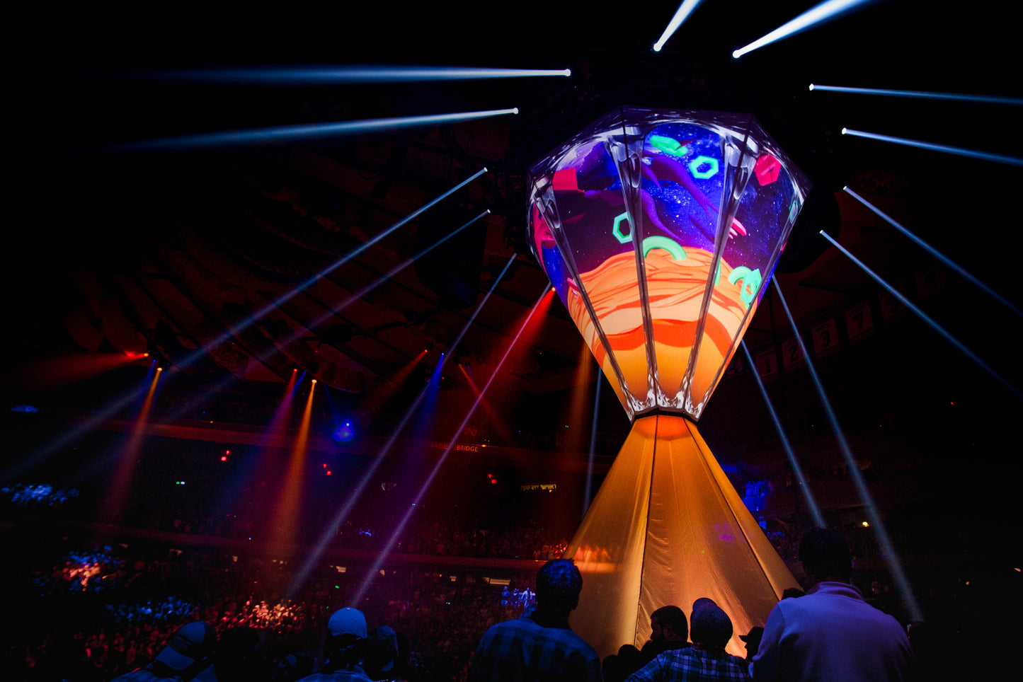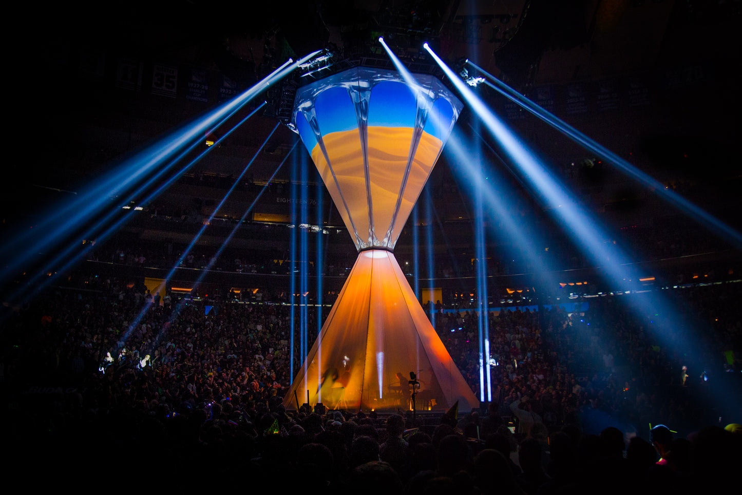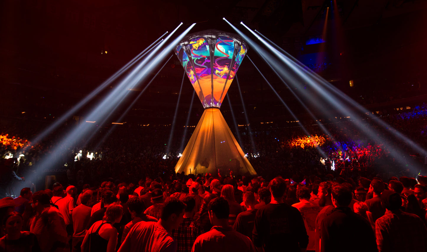 Phish are renowned for their standout New Year’s Eve stunts, so for 2016 we created a bespoke set piece. The experience began with a surprise; the band started their third set on a small B stage in the centre of the arena. As they began playing ‘No Men In No Man’s Land’ a giant UFO-like object began to descend from the ceiling. The object slowly transformed, enclosing the band in a giant fabric psychedelic hourglass. The top half was projected with 360-degree video content, showing digital sand trickling into a desert then whipping up into tempestuous sandstorms. The lower half was illuminated with kaleidoscopic lights and the band’s silhouettes swam in an eye-candy world of color.